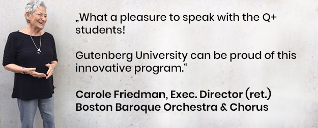 Das Studienprogramm Q+ beherbergt eine stetig wachsende Gemeinschaft von offenen und neugierigen Personen, die mehr wissen wollen und schafft Querverbindungen zwischen Gesellschaft und Wissenschaft. Unsere Community besteht aus Studierenden und Lehrenden der JGU, aus Einrichtungen, die den Wissenschaftsstandort Mainz maßgeblich mitgestalten, sowie aus Kooperationspartnerschaften, die prägend für Kultur und Gesellschaft sind.